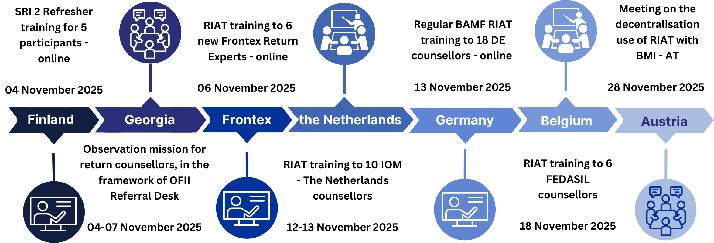Das österreichische Bundesministerium für Inneres (BMI) hat Interesse an einer Dezentralisierung der Nutzung von RIAT ausgesprochen. In diesem Zusammenhang fand ein Treffen in den Räumlichkeiten der Bundesagentur für Betreuungs- und Unterstützungsleistungen (BBU) statt, die derzeit die Rückkehrberatungsaktivitäten landesweit überwacht.